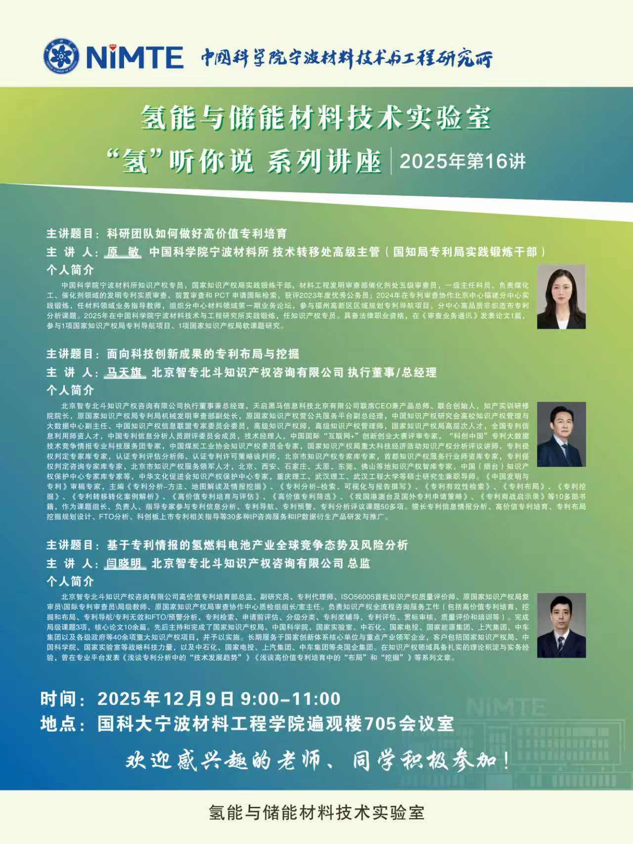 科研团队如何做好高价值专利培育主讲 、面向科技创斯成果的专利布局与挖据、基于专利情报的氢燃料电池产业全球竞争志势及风险分析——“氢”听你说系列讲座