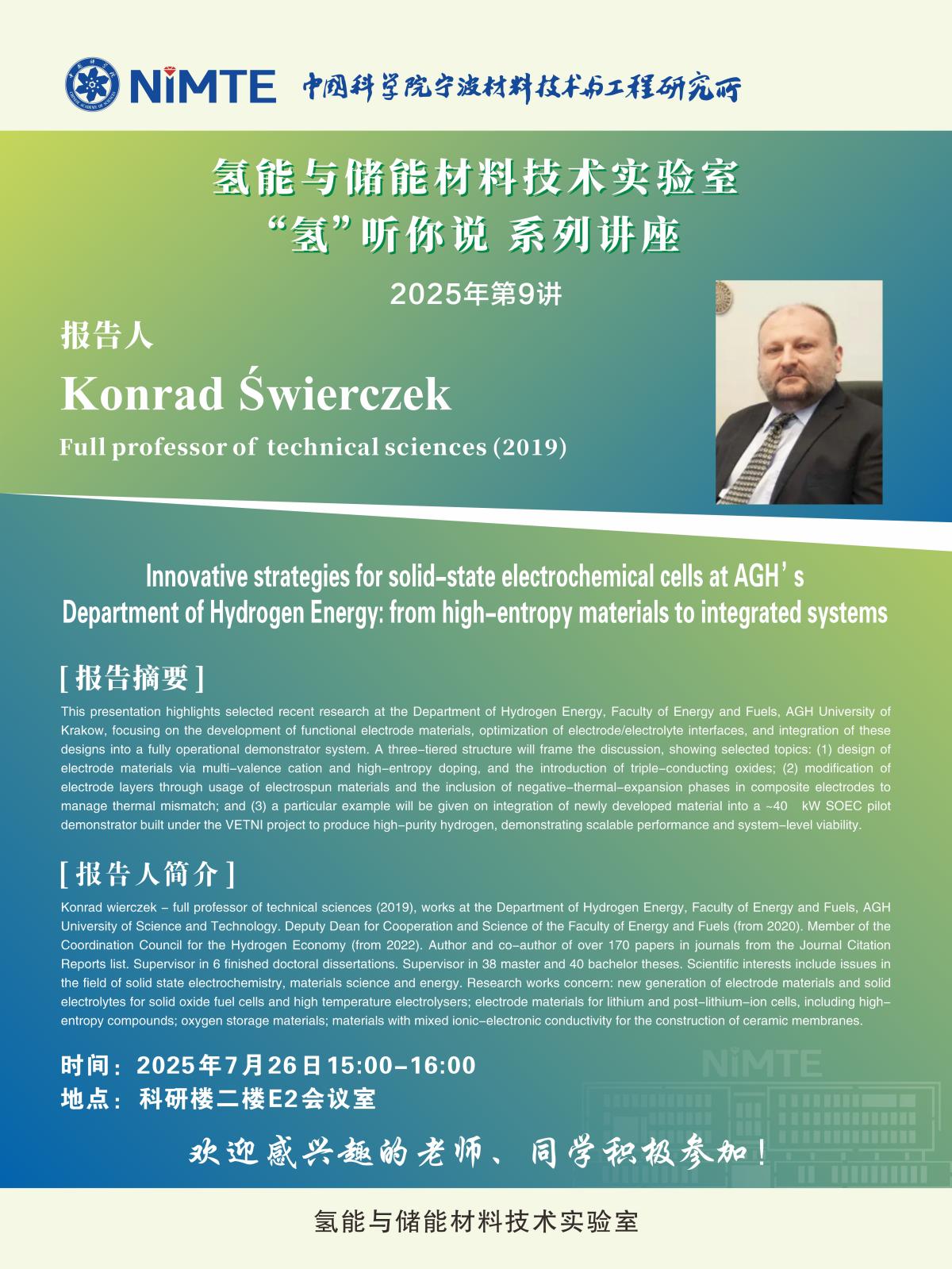 Innovative strategies for solid-state electrochemical cells at AGH'sDepartment of Hydrogen Energy: from high-entropy materials to integrated system——“氢”听你说系列讲座
